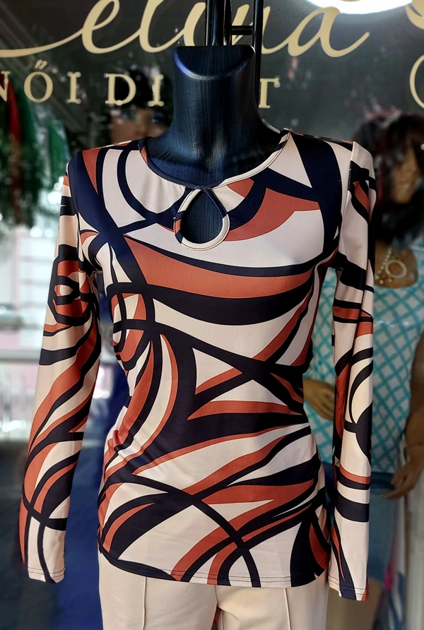 Egyedi és kifinomult stílus, amely minden alkalomra tökéletes! Ez a barna-fekete absztrakt mintás női felső a nőiességet és az eleganciát ötvözi a kényelemmel. Az elől, a mell résznél található dekoratív csepp kivágás különleges megjelenést biztosít, amely egyedivé varázsolja a felsőt.