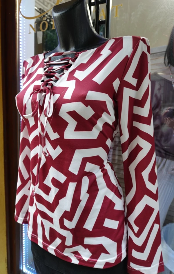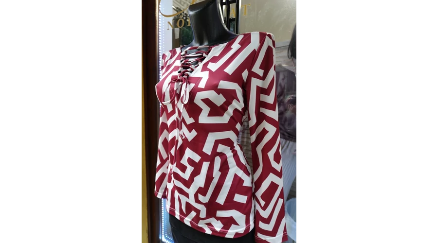 Minta: A női elegáns felső fehér és bordó árnyalataiból álló absztrakt mintával díszített