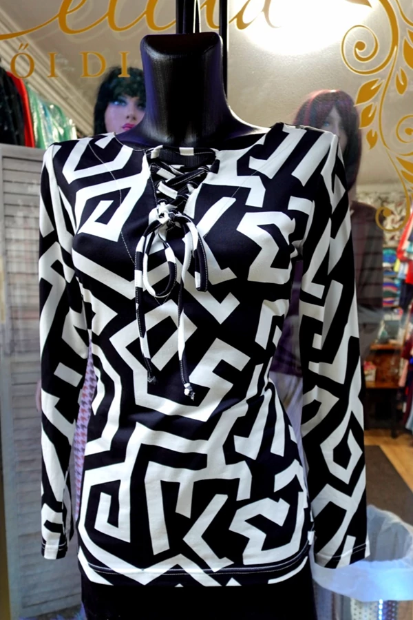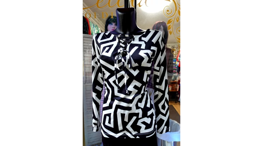 Minta: A női elegáns felső fehér és fekete árnyalataiból álló absztrakt mintával díszített