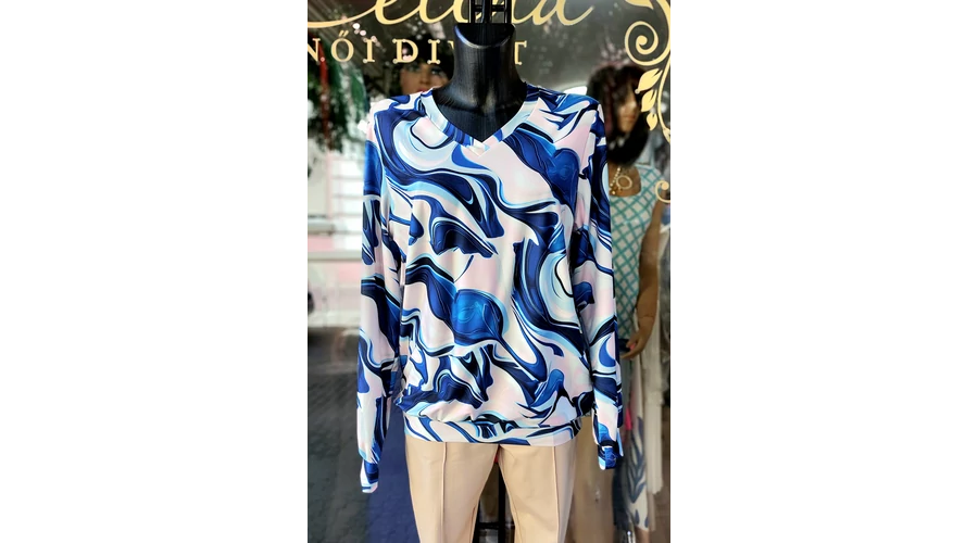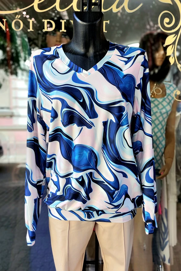 Ez a hosszú ujjú női felső tökéletes választás a hétköznapokra és alkalmi megjelenéshez egyaránt. A V-kivágás nőies vonalat kölcsönöz, míg az alul passzés kialakítás szépen formálja az alakot. Az ujjak végén széles mandzsetta gondoskodik az elegáns és modern hatásról.