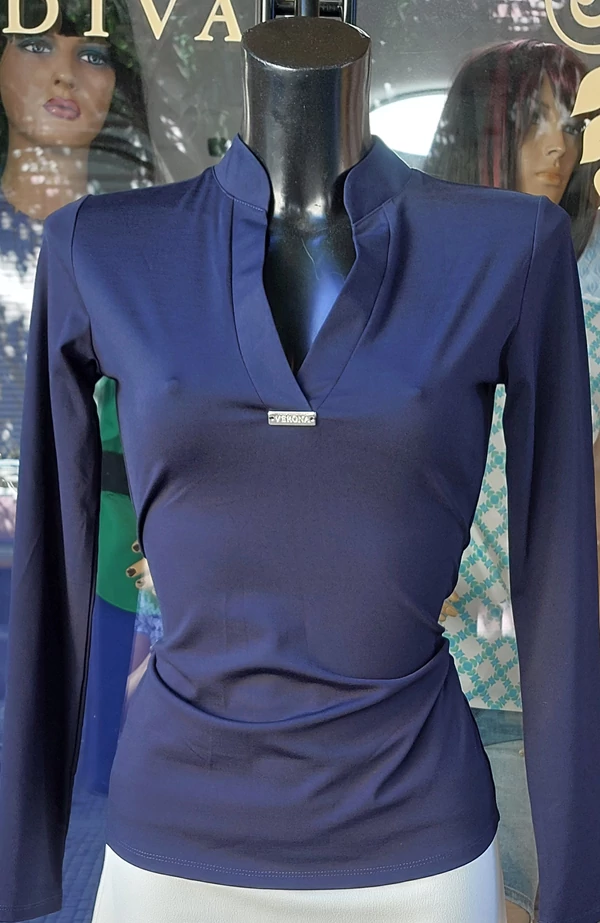 - ez a sötétkék női felső egyszerre funkcionálhat elegáns női pólóként vagy blúzként, így ideális irodába, üzleti találkozókra vagy akár esti programokra is.