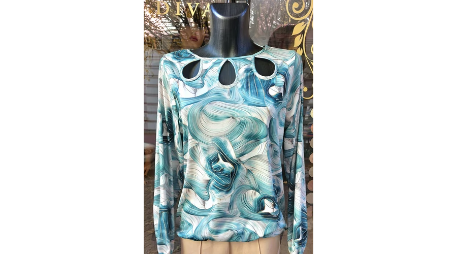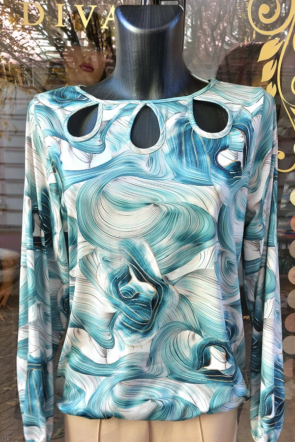 A türkiz, zöldes, kékes árnyalatú, gumis aljú alkalmi női felső igazi alapdarab minden gardróbban. Elasztikus, kényelmes anyaga, a három csepp kivágás és az enyhén csillogó minta nőies és különleges megjelenést biztosít. Válaszd ezt a magyar gyártású alkalmi női felsőt, ha egyszerre keresel eleganciát és kényelmet.