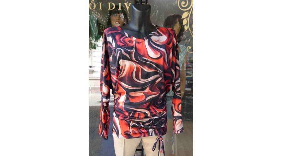 Alsó rész: A női elegáns vöröses bordó színű felső ,alsó részen található kis kötővel ellátott széles passzés. A megköthető kis masni nem csak csinos hanem praktikus is egyben a tunikán.