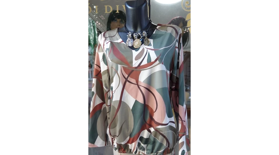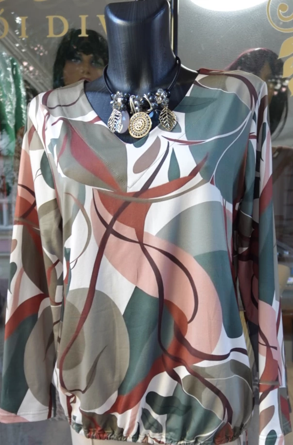 Lépj be az elegancia világába ezzel a különleges alkalmi női felsővel! A zöld-barna-olíva színkombináció és az elegáns mintázat minden alkalomra stílusos megjelenést biztosít.