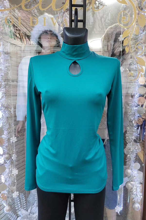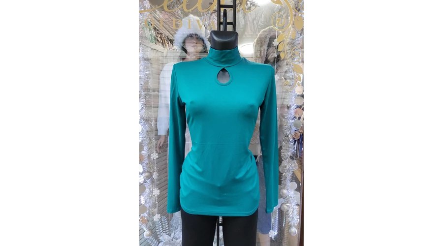 A félgarbó nyakrész modern és kifinomult hangulatot ad ennek a fenyőzöld női felsőnek, miközben az elől található csepp alakú kivágás nőies és különleges részletként emeli ki az alkalmi stílust.
