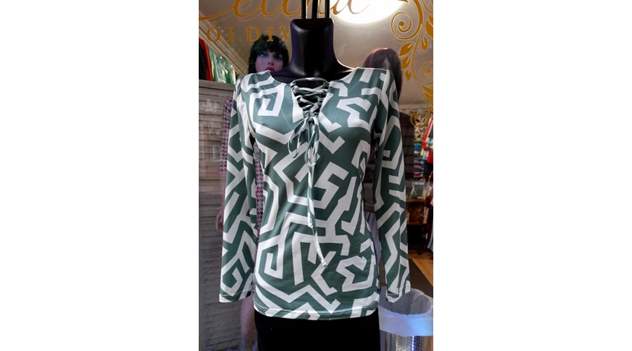 Minta: A női elegáns felső fehér és zöld árnyalataiból álló absztrakt mintával díszített